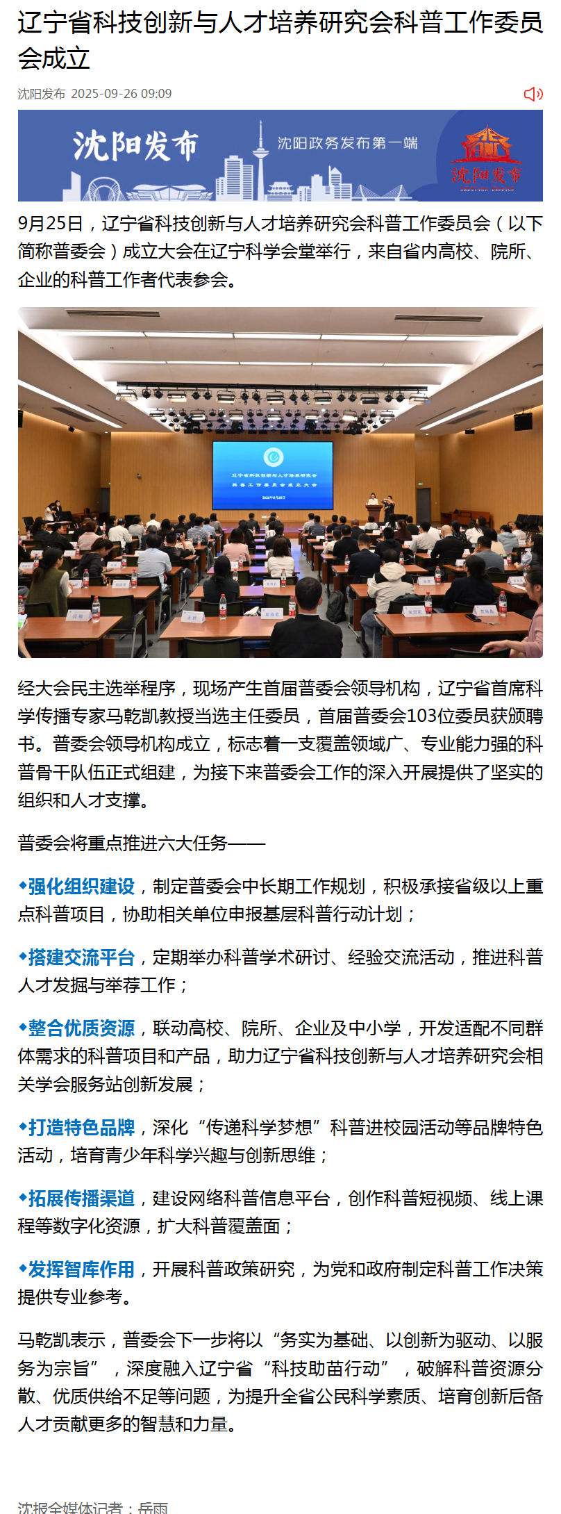 沈阳发布:辽宁省科技创新与人才培养研究会科普工作委员会成立