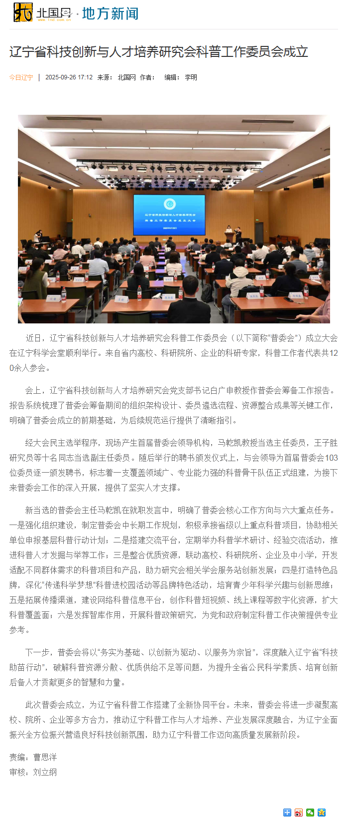 北国网:辽宁省科技创新与人才培养研究会科普工作委员会成立