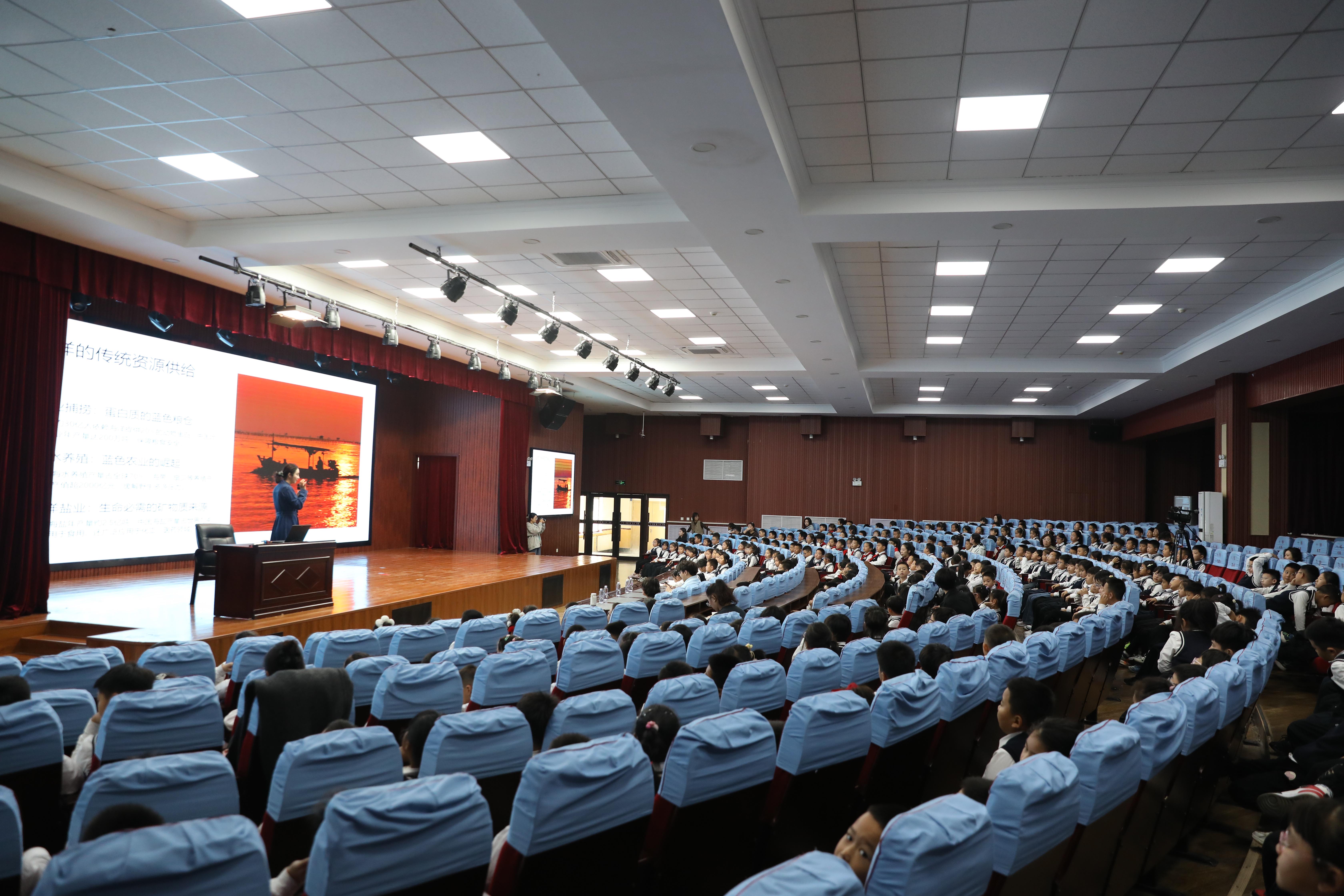 讲座从海洋里有什么开始,与同学们共同分享海洋生物多样性、海洋经济、海洋产业和海洋未来的可能与想象。共分为四个部分,分别为海洋经济,主讲师生以“超市”的比喻开始,从海洋渔业、船舶远洋和滨海度假三个海洋经济中感受最强烈的部分向同学们介绍海洋经济,生动的比喻和丰富多视觉呈现方法,提高了孩子们对海洋经济发展重要性的认识和投入海洋经济发展建设的热情。海洋科技部分,同学们了解到了航行中船舶的“耳朵”——声纳技术,看到了我国先进的水下机器人技术,了解了海上风力发电新能源,更进一步深刻的体验到推动发展的科技创新的重要性。在海洋生态建设方面,充分认识了海洋经济发展和生态系统以及人类幸福的息息相关。讲座最后,老师向同学们介绍了“美丽中国我是行动者”的国家倡议,并向同学们发出人人争当小卫士的共创倡议,共同拥抱蔚蓝未来。