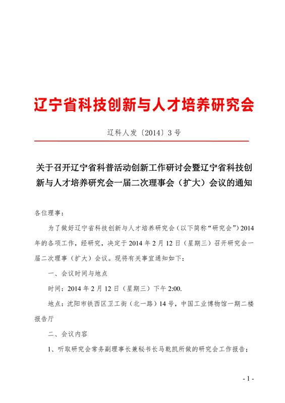 辽科人发〔2014〕3号辽宁省科技创新与人才培养研究会一届二次理事(扩大)会议通知