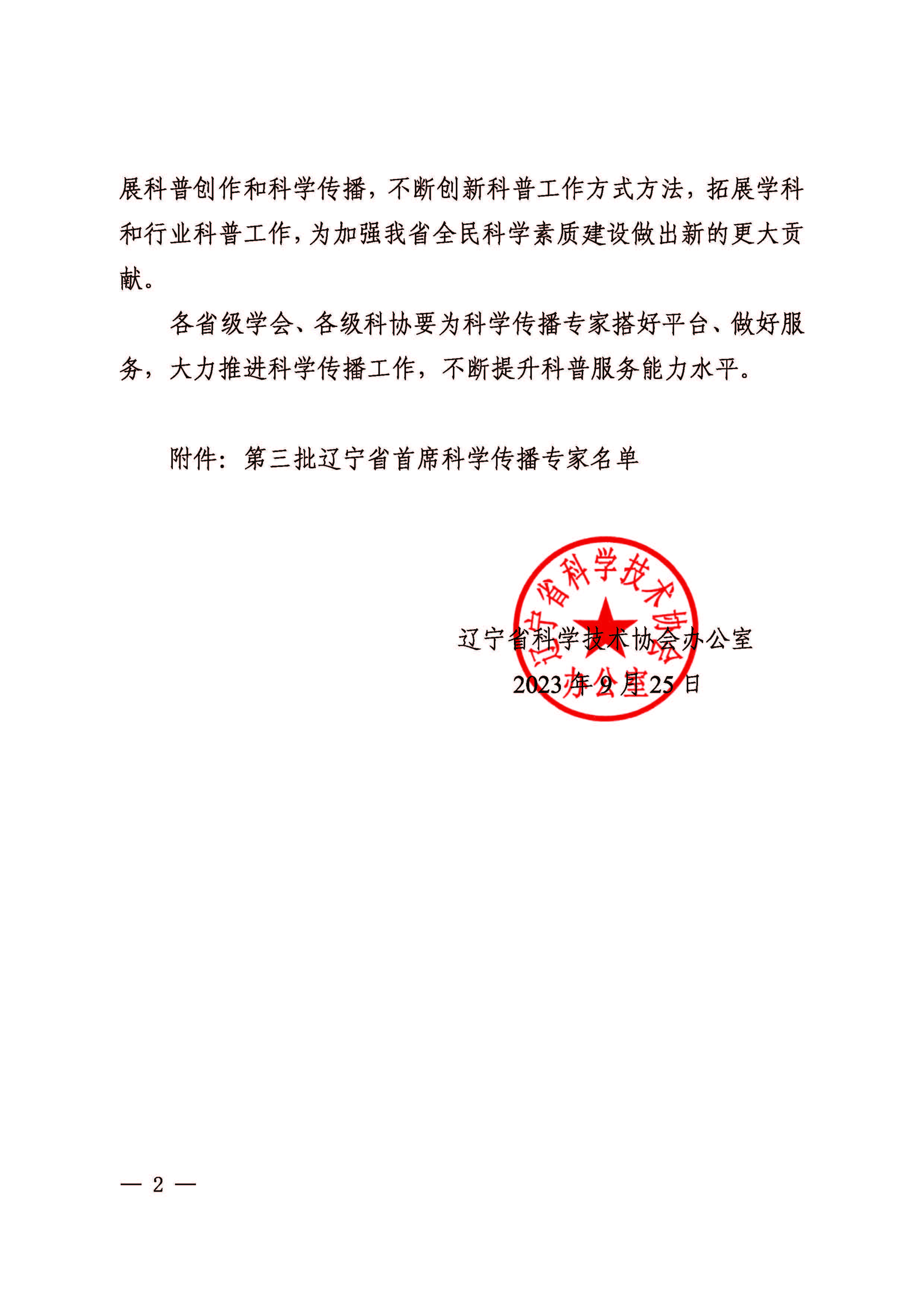 关于聘任第三批辽宁省首席科学传播专家的通知