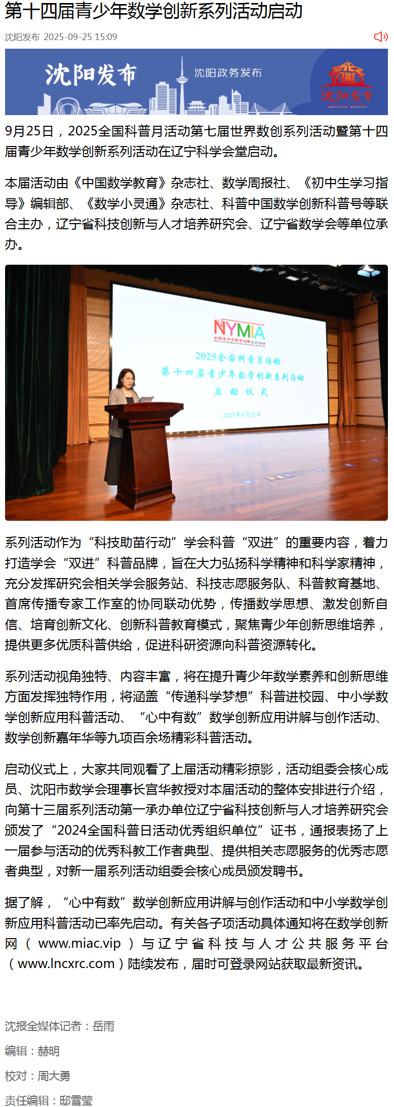 沈阳发布:第十四届青少年数学创新系列活动启动