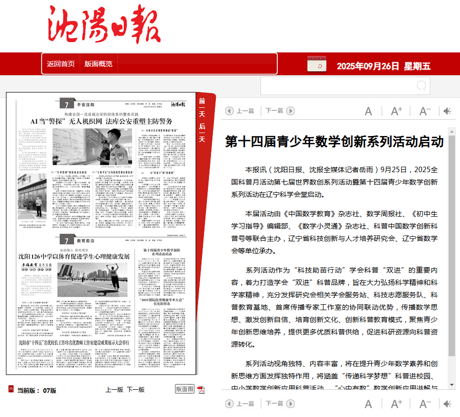 沈阳日报:第十四届青少年数学创新系列活动启动